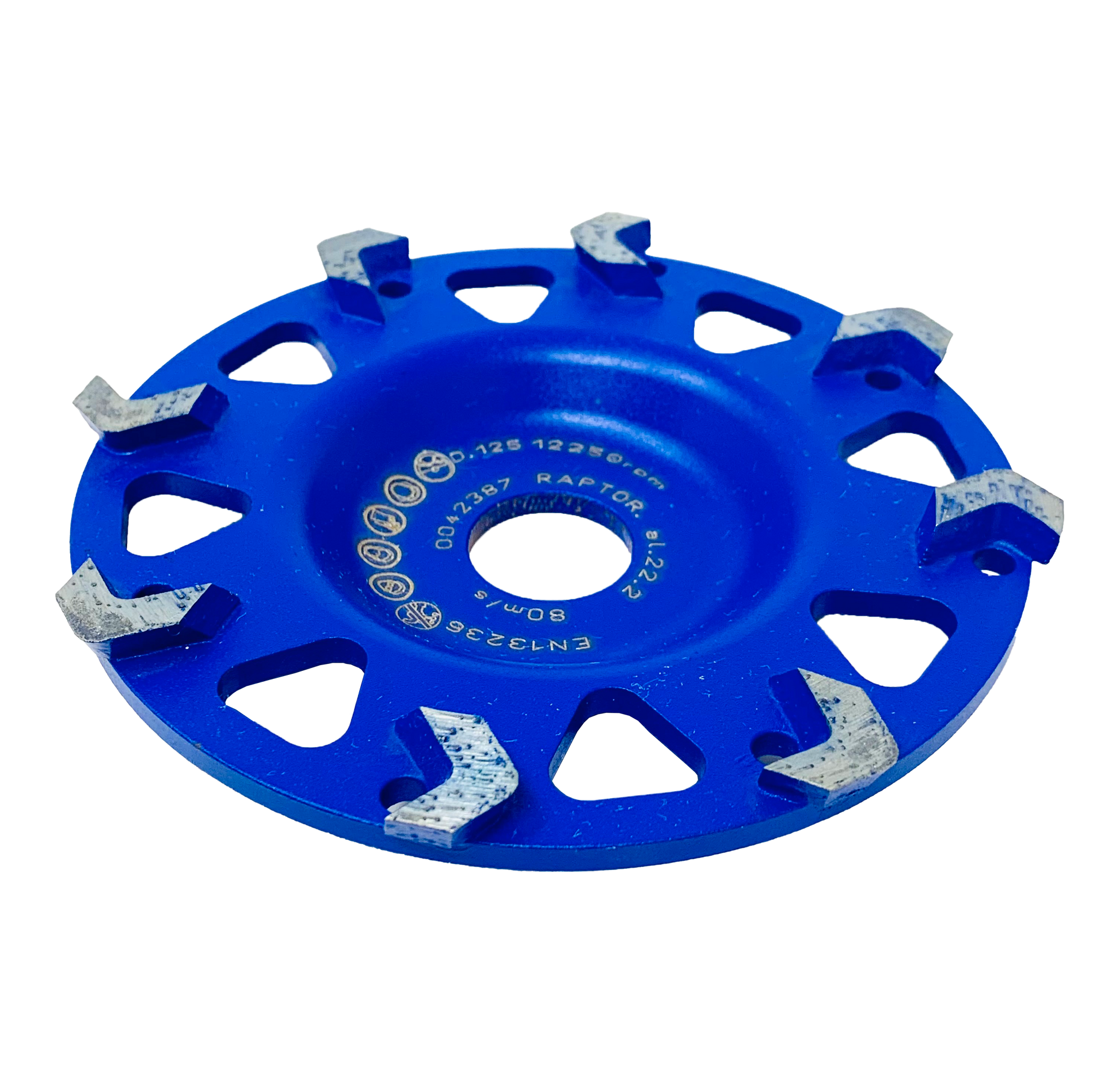 The BEAR CLAW cupwheel is specifically engineered for fast removal of surface coatings and cementitious underlayment/overlayment, while leaving a clean 25 grit surface profile. The individual segments combine a tungsten carbide front shield on the cutting edge with sintered cobalt segments and our very special blend of high performance diamond abrasives. The results are awe inspiring speed and maximum efficiency for the user.